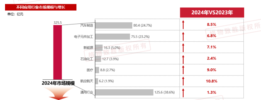 - 气动元器件市场2024年中国市场业绩约为325.5亿元,较去年同比5%左右的增长,行业需求依赖下游制造业,汽车制造尤其是新能源汽车和电子元件加工如电子半导体行业贡献主要增量,另外受工业自动化程度提升、国产替代政策推动的影响,整体保持较为稳定的增长。