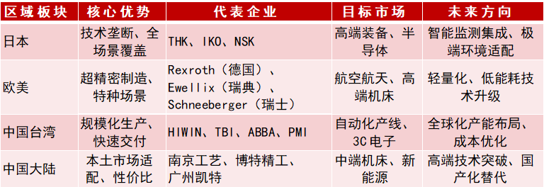 全球直线导轨行业呈现“寡头垄断主导、区域集群互补”的特征,按产能分布,中国台湾(32%)、日本(26%)、中国大陆(18%)合计占据全球76%的产能份额;按企业份额,THK、上银科技(HIWIN)、NSK三家企业垄断全球约65%的市场份额,形成显著的头部效应。从技术梯度看,日本、德国企业主导高端市场,中国台湾企业在中高端领域形成规模优势,中国大陆企业加速中端替代并向高端突破,东南亚、美洲企业则聚焦区域配套市场。