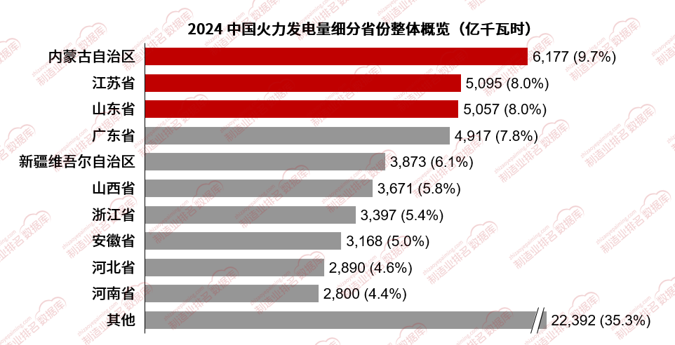 火电发电量头部省份集中于能源大省与工业大省,北方省份凭借资源优势占据主导,前五名合计贡献超3成火电产量,撑起全国火电供给基本盘:内蒙古以6177亿千瓦时登顶,同比增长4%,依托丰富煤炭资源与坑口电站布局,既是火电大省,也是风电、光伏等绿电增长核心区,能源综合供给能力领跑全国;江苏、山东、广东紧随其后,分别以5095亿千瓦时、5057亿千瓦时、4917亿千瓦时跻身前列,其中江苏、广东作为工业与人口大省,火电成为保障用电高峰的核心支撑。