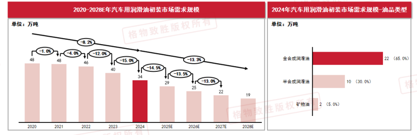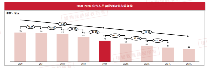 - 市场规模从2020年的100亿元持续下降至2024年的72亿元,预计到2028E年将进一步下降至44亿元;下跌的根本原因是电动汽车普及,燃油车新车销量进入下行通道,纯电动汽车不需要加注传统发动机油,其初装油液需求远低于燃油车,直接导致初装机油需求减少。