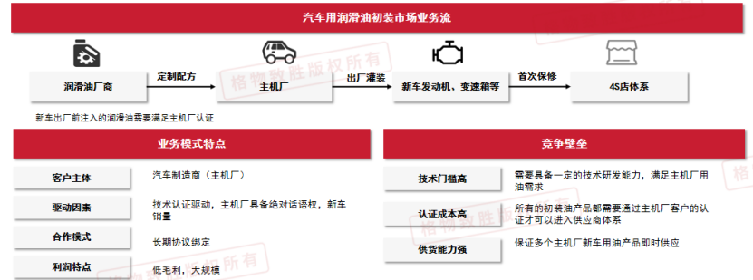 - 汽车用润滑油的初装市场核心客户为主机厂,该业务板块技术门槛颇高,一方面需要润滑油厂商具备强劲技术实力,能够参与发动机用油及其他场景用油的定制开发;另一方面需通过主机厂严苛的认证流程。